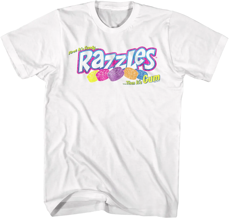 First it's candy, then it's gum! Morphing from a tasty, fruit-flavored candy into an equally tasty and chewable piece of gum, Razzles offer a hybrid of two treats in every round, bite-sized piece. Let everyone know you are a fan when you wear this Classic Logo Razzles T-Shirt!