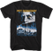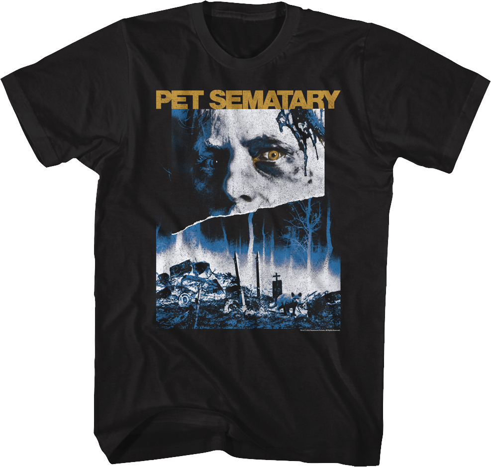 This Pet Sematary t-shirt features the poster artwork for the 1989 horror classic. The poster shows Victor Pascow on the top half of the image and Church the cat in the pet cemetery on the bottom half of the image.