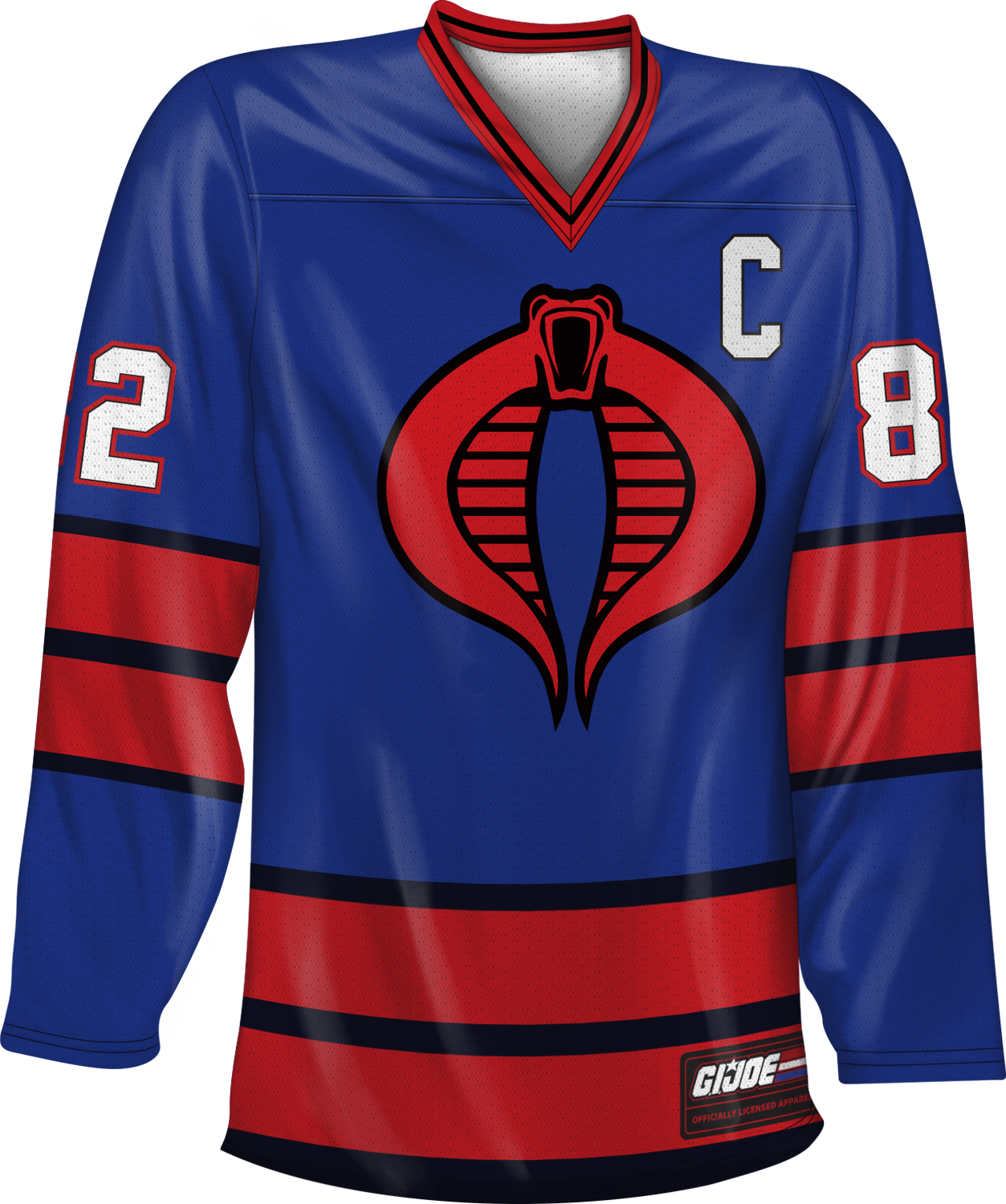 This hockey jersey is designed to look and feel just like an authentic team jersey. The jersey includes blue, red and black colors to match the unmistakable Cobra logo. The jersey shows the Cobra logo on the front and the name Cobra on the back. The jersey is given the number 82 because 1982 was the year that the GI Joe toyline was relaunched in a 3.75-inch scale complete with vehicles, playsets and background stories involving GI Joe and Cobra Command. These toys were the inspiration for the GI Joe: A Real American Hero animated series.