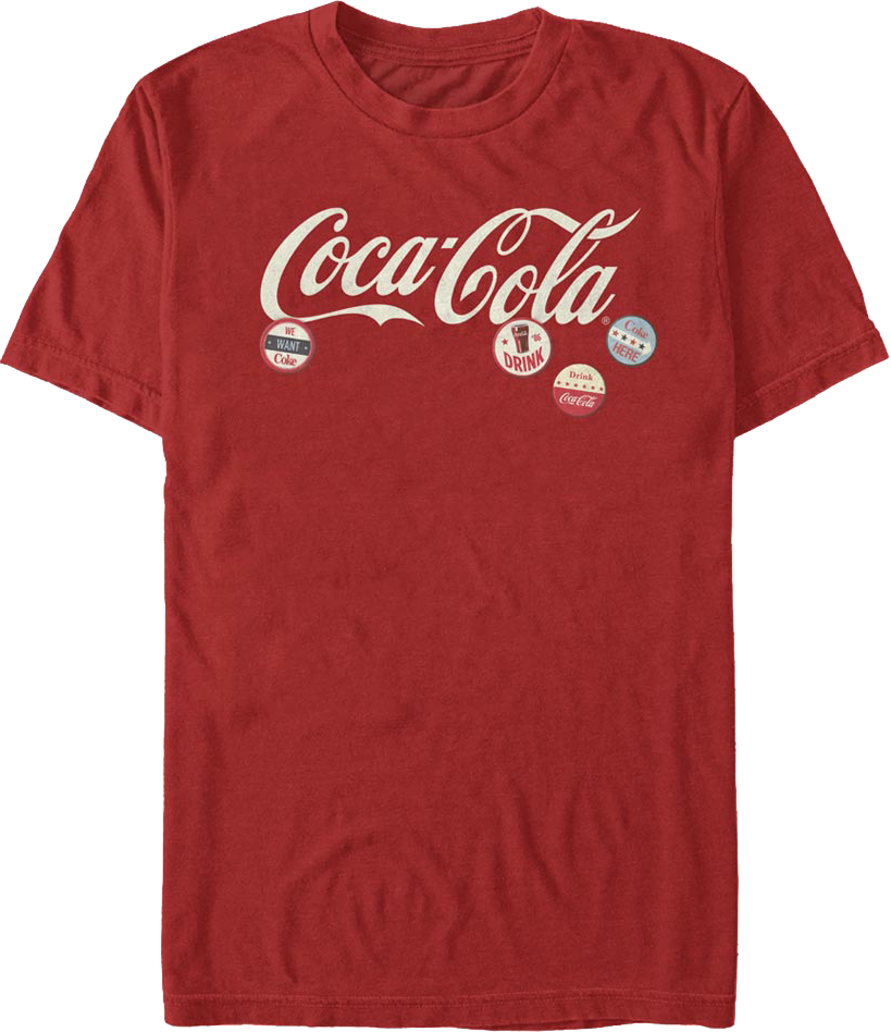 This Coca-Cola t-shirt is designed to look like you are wearing vintage buttons that read "We Want Coke", "Coke Here" and "Drink Coca-Cola".