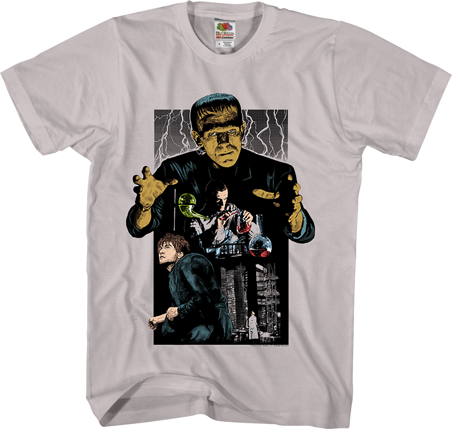 This Collage Frankenstein T-Shirt features Boris Karloff as the monstrous creation, Colin Clive as Dr. Frankenstein, and Dwight Frye as Fritz, the hunchback assistant. In the story, the doctor pieced together parts of dead bodies to create the infamous monster.