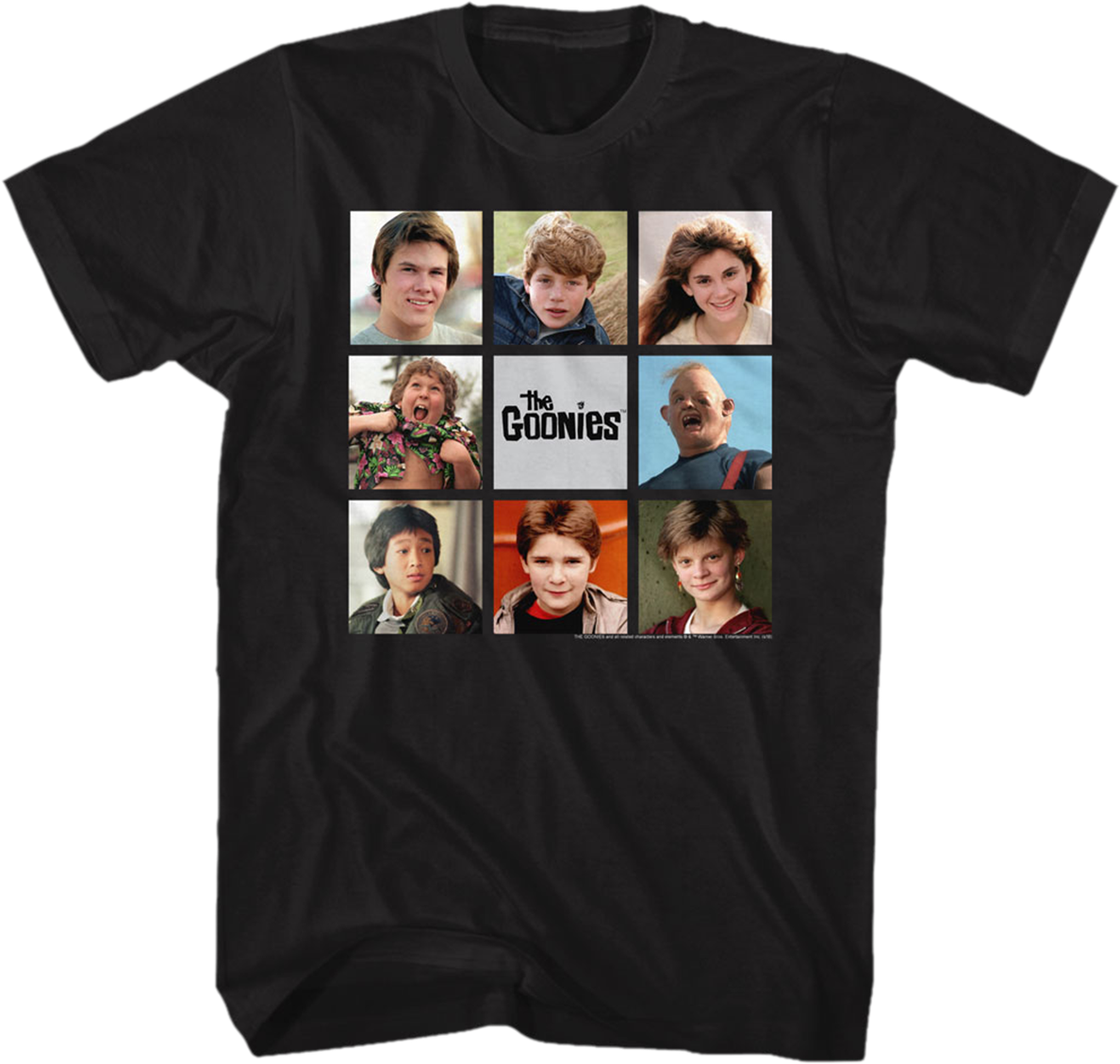 This shirt shows Brand, Mikey, Andy, Chunk, Sloth, Data, Mouth and Stef. These are the characters that found One-Eyed Willy's treasure-filled pirate ship and escaped from the Fratelli brothers.