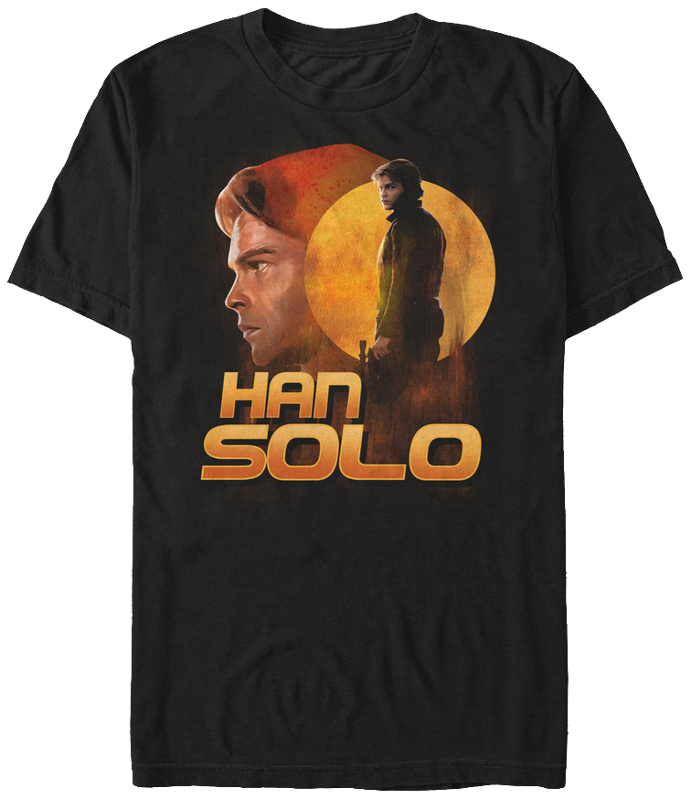 This Collage Han Solo Star Wars T-Shirt shows two images of Han Solo along with his name and a full moon background. The movie Solo: A Star Wars Story shows the early years of the smuggler's life. This popular character is not only known for being a gambler, but an expert pilot and a charmer of princesses.