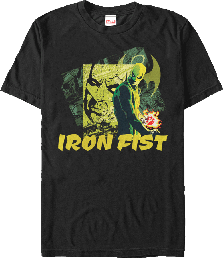 This Collage Iron Fist T-Shirt features the hero generating his chi into his fist with a comic page collage background. Since his debut in 1974, Iron Fist has been the hero that holds back the storm when nothing else can!
