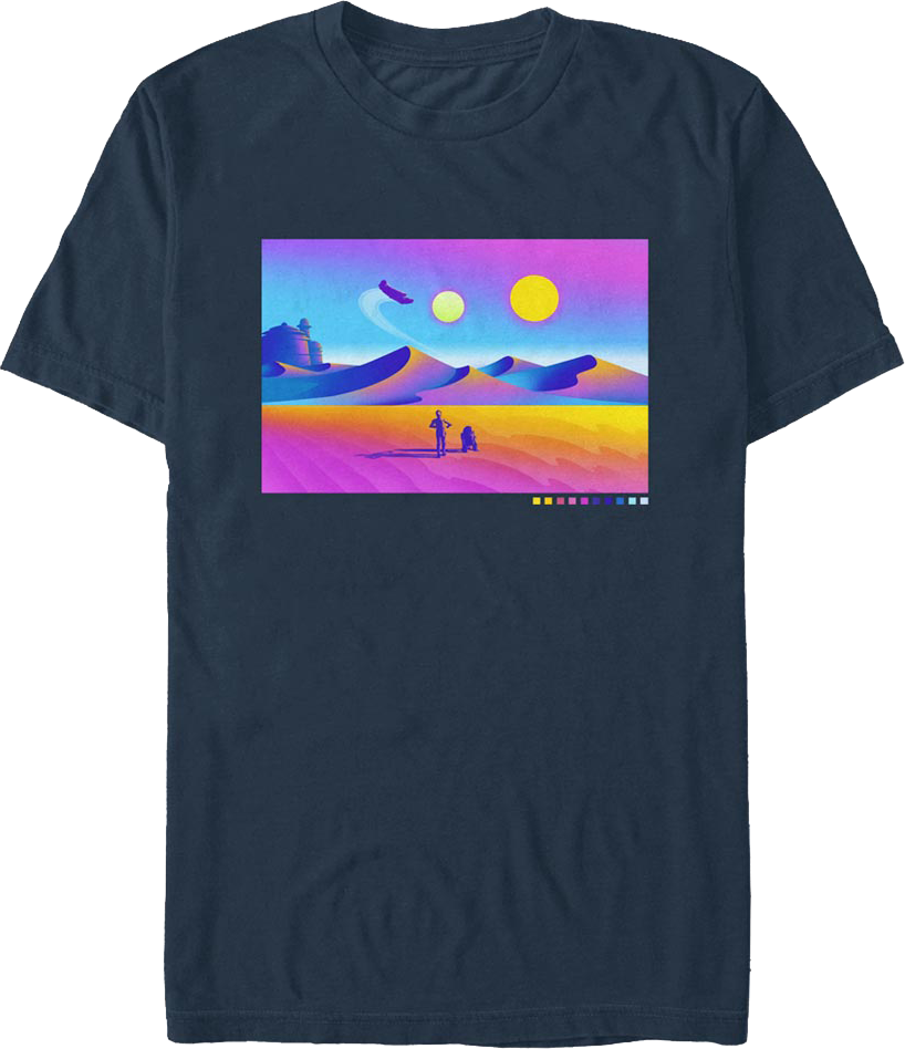 C-3PO and R2-D2 are droids who delivered a message from Princess Leia to Obi-Wan Kenobi, traveled with the Rebel Alliance to battle the Dark Side of the Force, helped to defeat the Galactic Empire, and became iconic figures in the Star Wars franchise. Everyone will instantly know you are a fan when you wear this Color Spectrum Journey Star Wars T-Shirt!