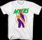 This Halloween t-shirt shows Michael Myers surrounded by spattered orange paint. The shirt includes the hand and knife that are seen on the poster artwork for Halloween, and the shirt reads Myers. The images are highlighted in bright, vibrant colors.