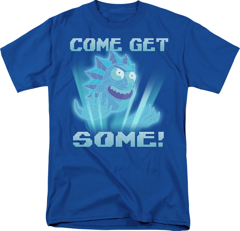 In the Rick And Morty season five episode titled "Mortyplicity", the Smiths suspect they're being hunted. Rick creates a decoy family. This t-shirt shows a decoy Rick saying, "Come get some!"