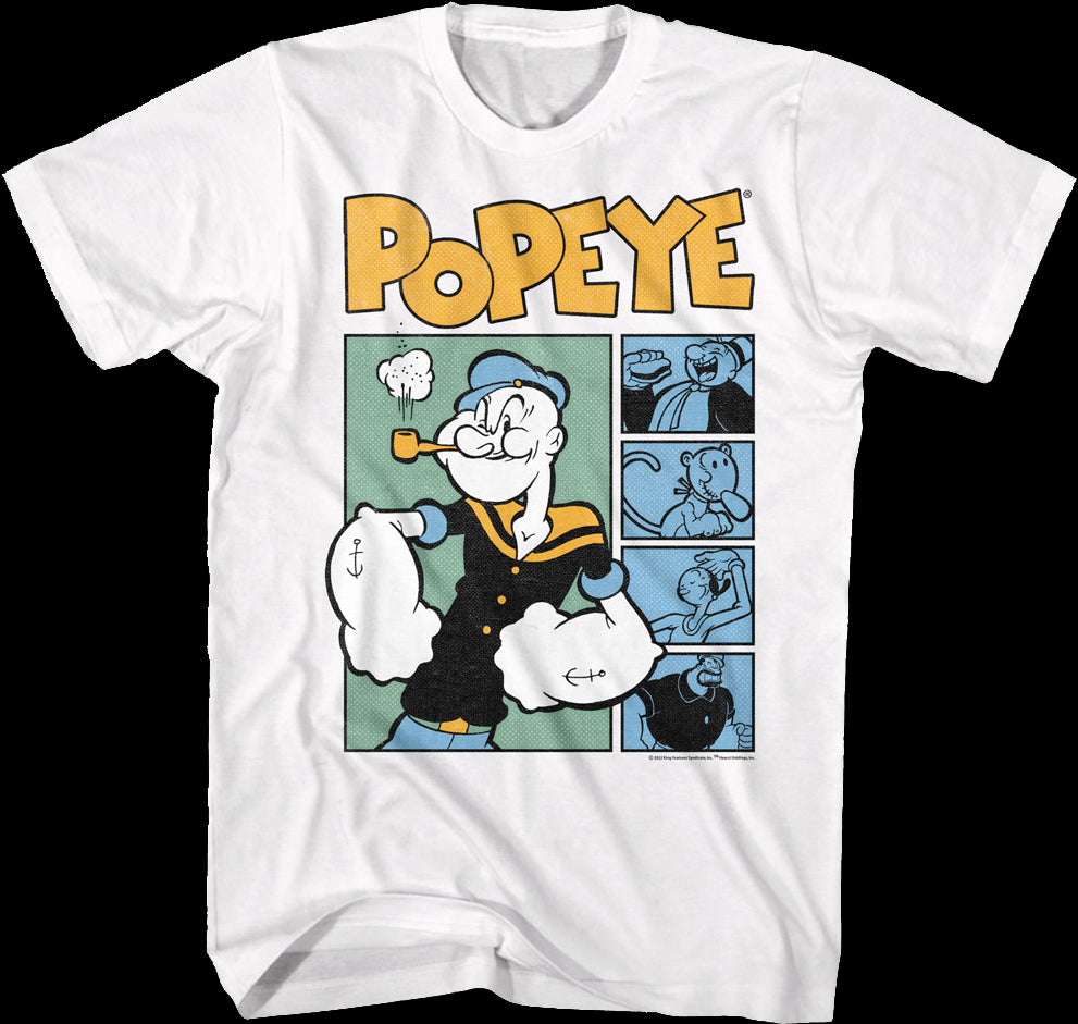 With the help of his friends and his trusty spinach, Popeye was able to battle the biggest bullies in Sweethaven, like Bluto. Let everyone know you are a fan of the heroic sailor man and his unforgettable supporting cast when you wear this Comic Panels Popeye T-Shirt.