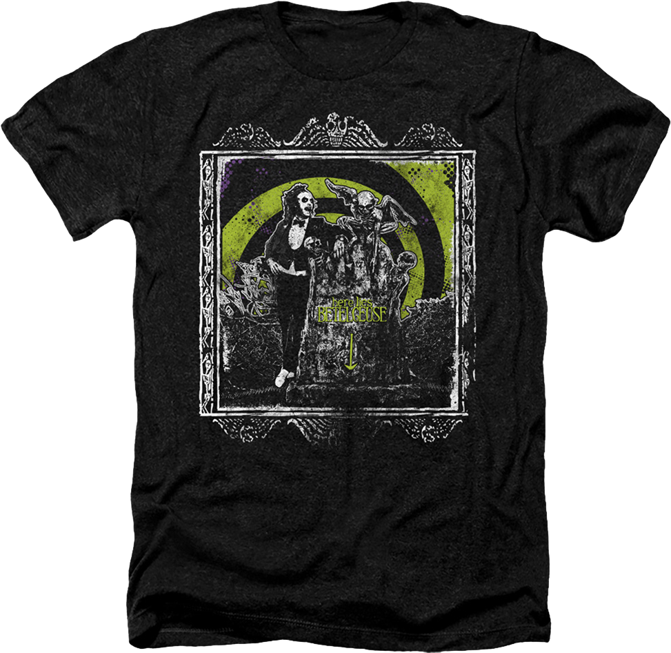 This 50% cotton/50% polyester heather Beetlejuice t-shirt features a framed image of the ghost with the most posing next to a tombstone that reads Here Lies Betelgeuse.
