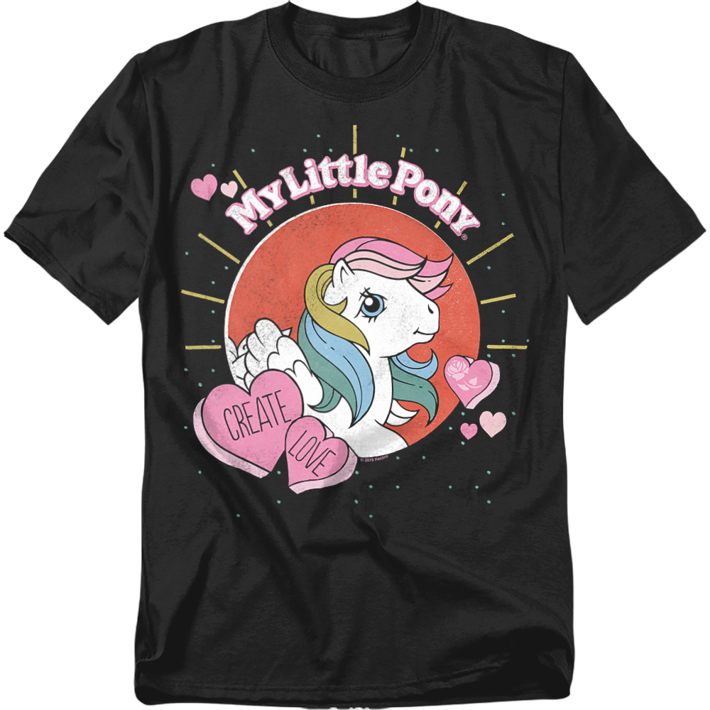 This Create Love My Little Pony T-Shirt shows Starshine, the Pegasus Pony with the rainbow mane and white coat. She is surrounded by hearts that show a blooming rose and the words "create love." Kids in the 1980's all loved their My Little Ponies with their cutie marks and individual personalities.
