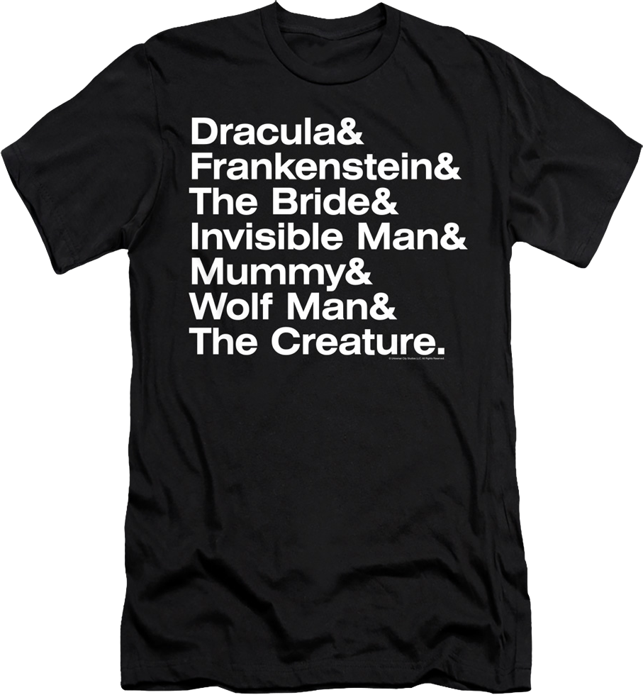 In 1931, Universal Pictures produced Dracula, starring Bela Lugosi and Frankenstein, starring Boris Karloff. Both movies were massive hits, and Universal was set to release some of the most frightening monsters in cinematic history. The names of these creatures of the night appear on this t-shirt. The names include Dracula & Frankenstein & The Bride & Invisible Man & Mummy & Wolf Man & The Creature.
