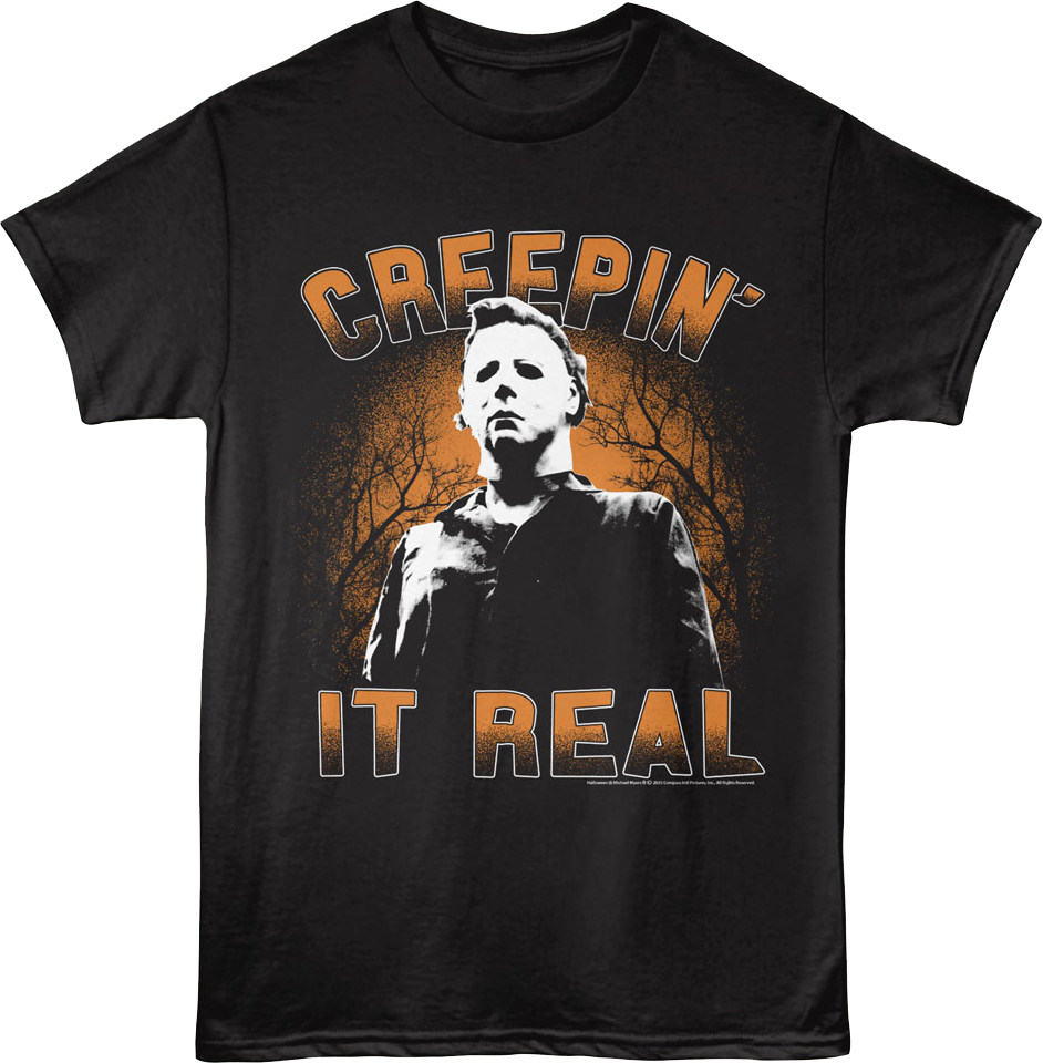 This Halloween t-shirt shows Michael Myers wearing his terrifying white mask. The shirt reads Creepin' It Real.