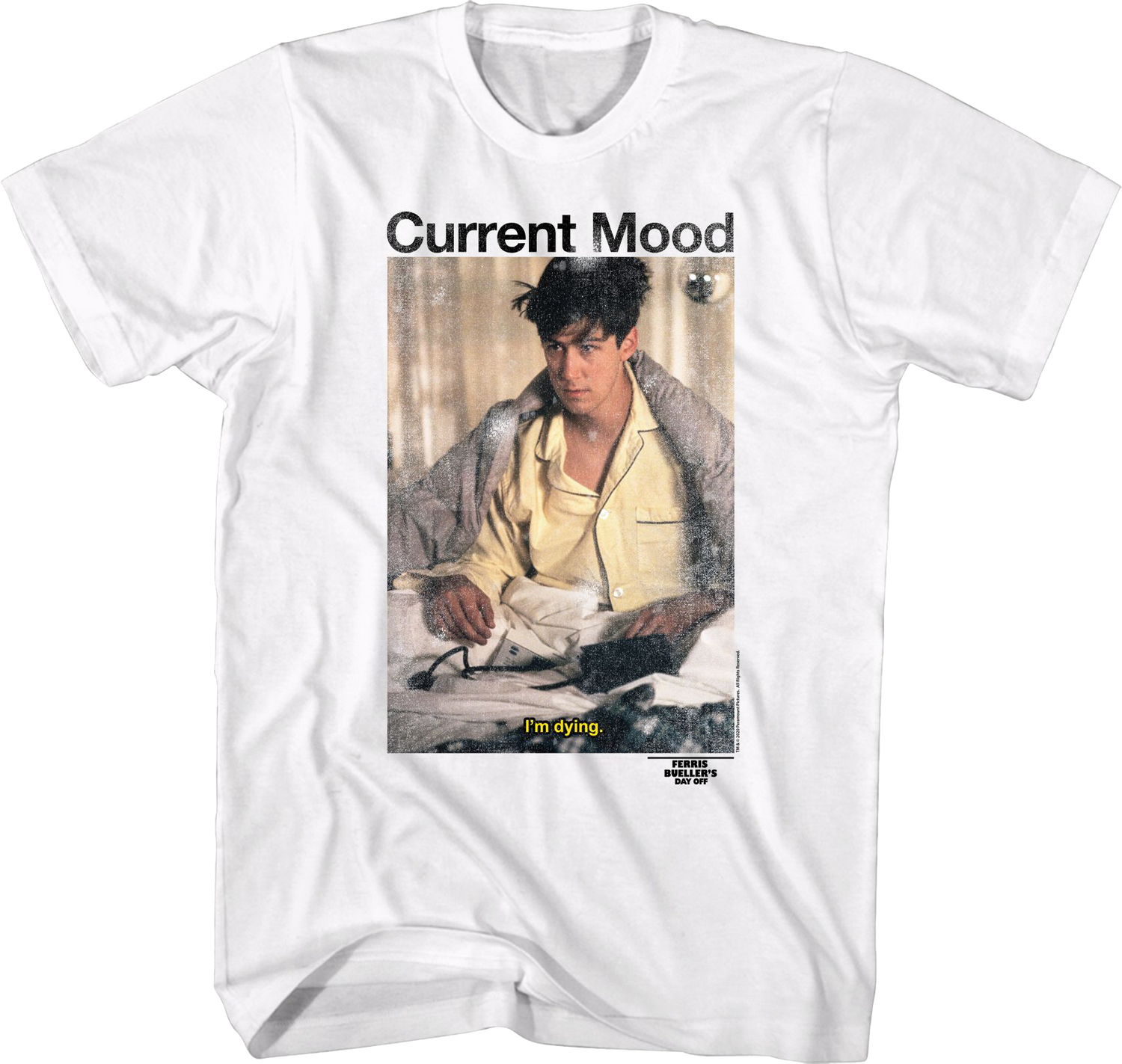 This Ferris Bueller's Day Off t-shirt features a picture of Cameron Frye. The caption in the picture shows Cameron's quote, "I'm dying." Above the picture, the shirt reads Current Mood.