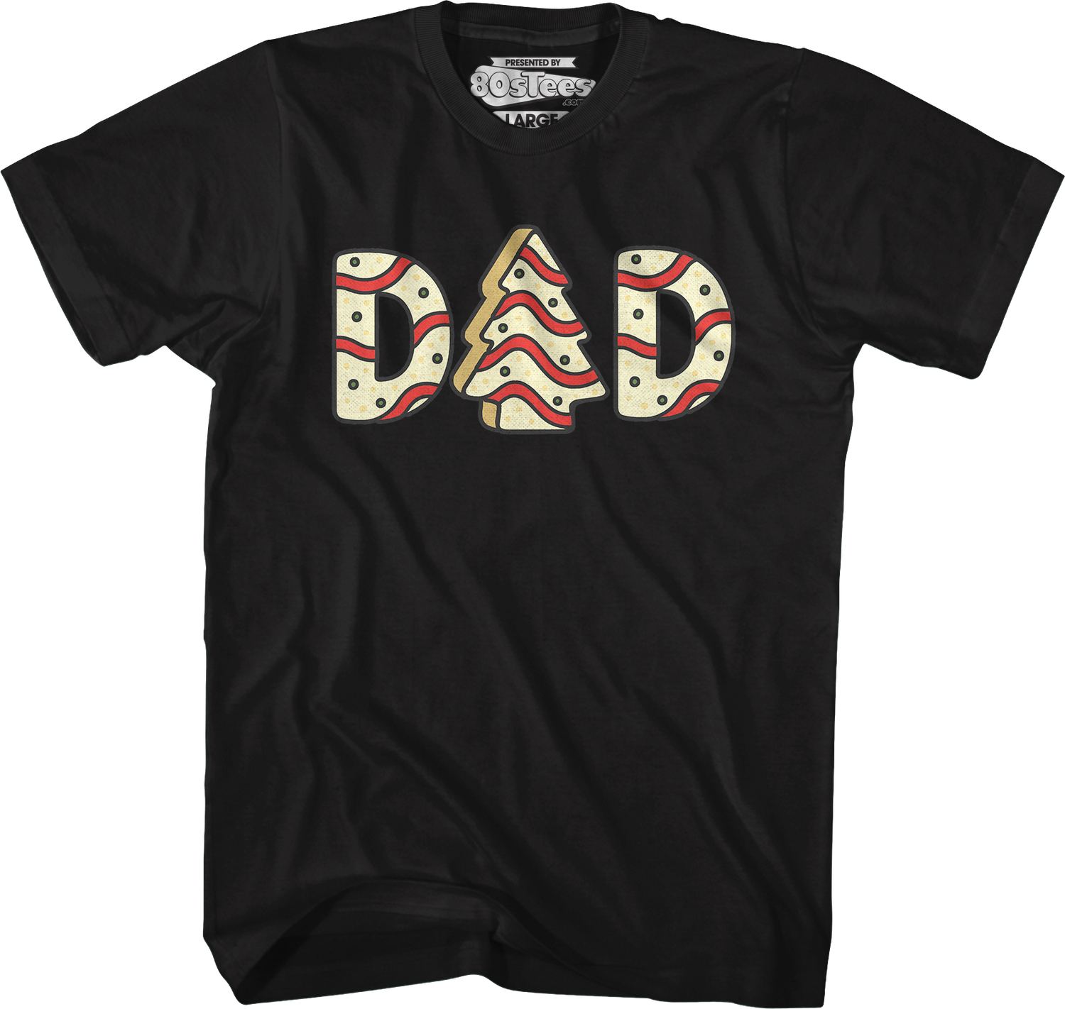 This 80sTees.com exclusive t-shirt shows the word "DAD", with a Christmas Tree Cake in place of the letter "A".
