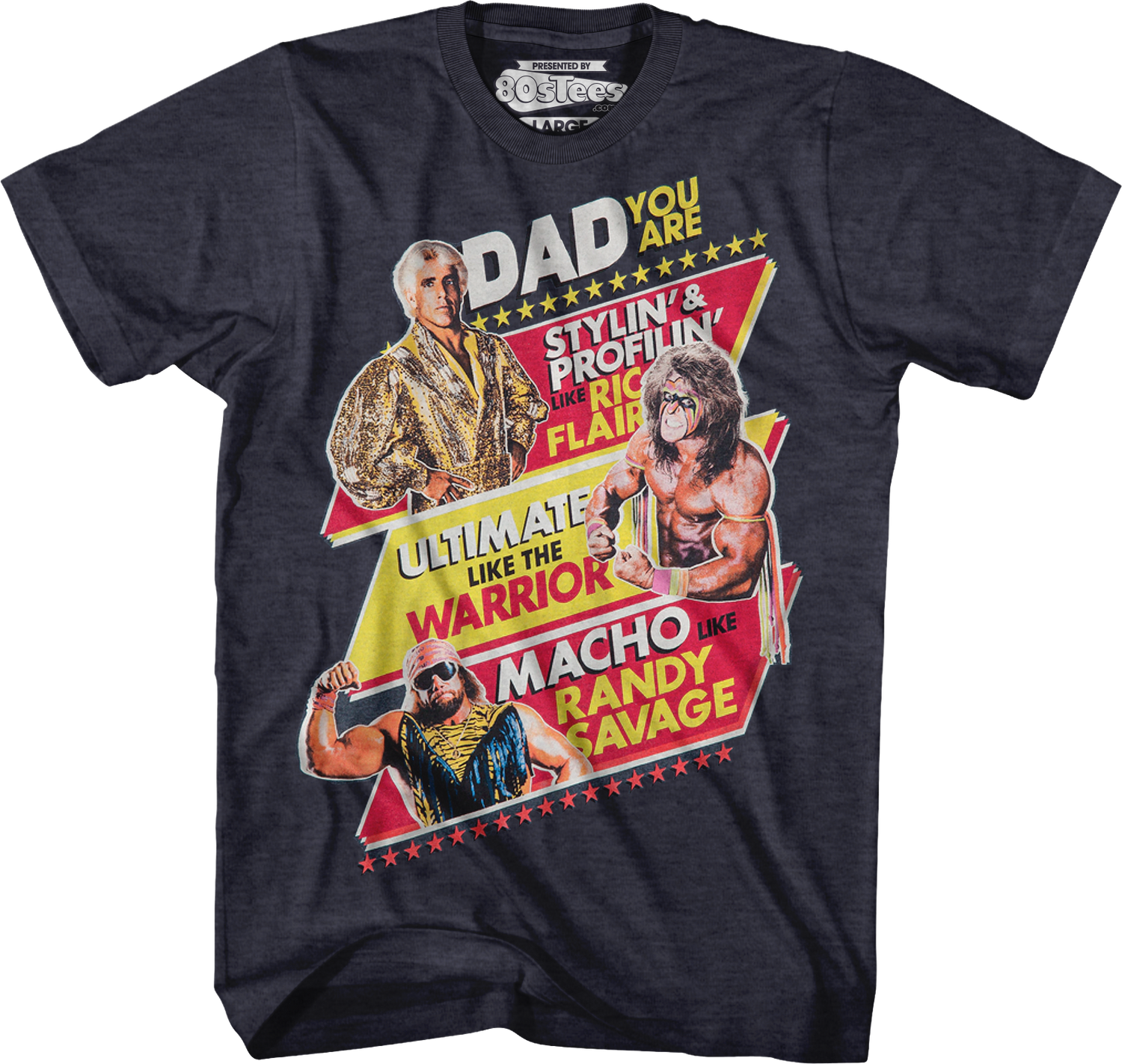 This Father's Day, show your dad that he is just as great as the sports entertainment immortals with this WWE Legends Father's Day t-shirt! This shirt shows "Nature Boy" Ric Flair, Ultimate Warrior and "Macho Man" Randy Savage. The shirt reads Dad You Are Stylin' & Profilin' Like Ric Flair, Ultimate Like The Warrior, Macho Like Randy Savage.