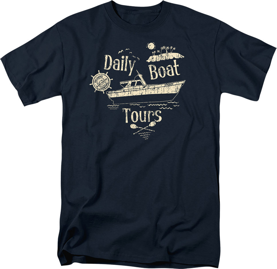 On Gilligan's Island, the skipper, his first mate, and five passengers set sail for a three-hour tour on the SS Minnow, which would be shipwrecked in a rough storm. The seven characters found themselves on a desert isle, where their misadventures created one of the greatest sitcoms of all time. Everyone will immediately know you are a fan when you wear this Daily Boat Tours Gilligan's Island T-Shirt!