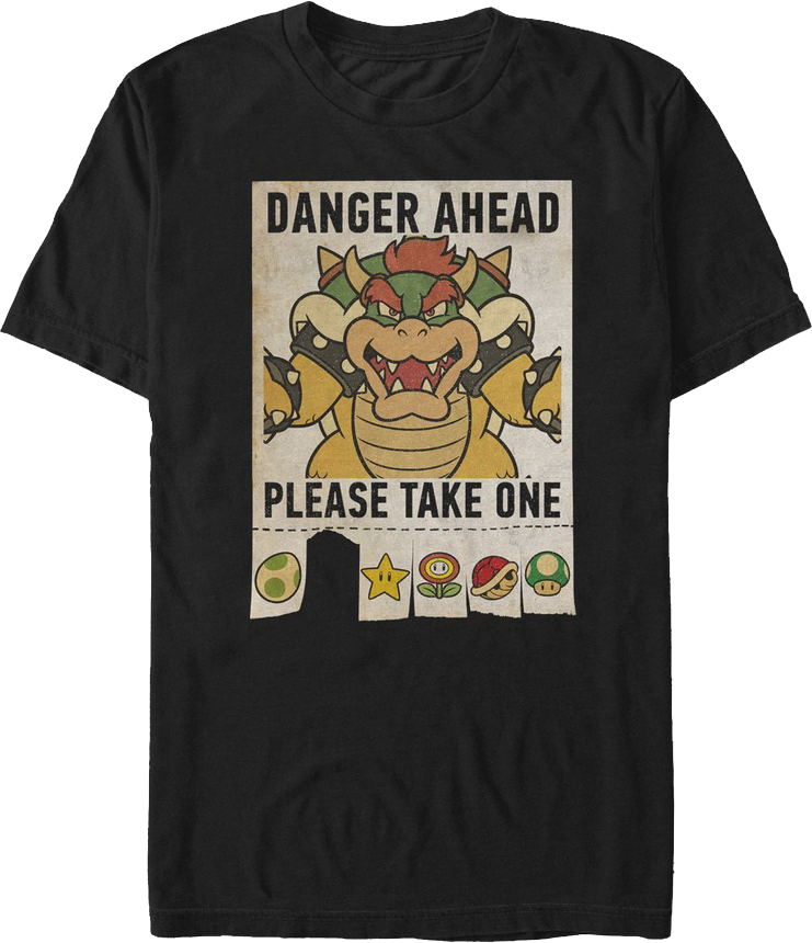 This Super Mario Bros. t-shirt features an image of Bowser on a pull-tab poster. The poster reads Danger Ahead Please Take One. The pull-tabs show items that will help Mario to reach the king of the Koopa Troopas.
