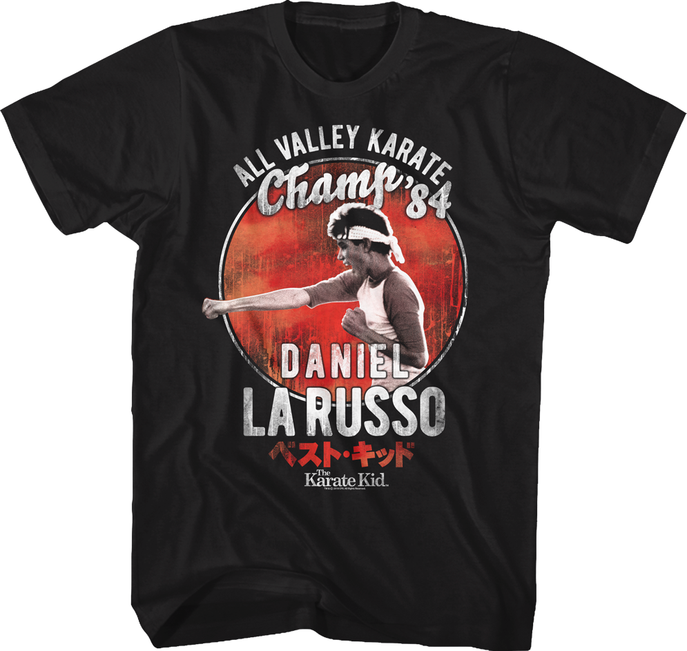 This Karate Kid t-shirt features an image of Daniel LaRusso throwing a punch. The shirt reads All Valley Karate Champ '84 Daniel LaRusso.