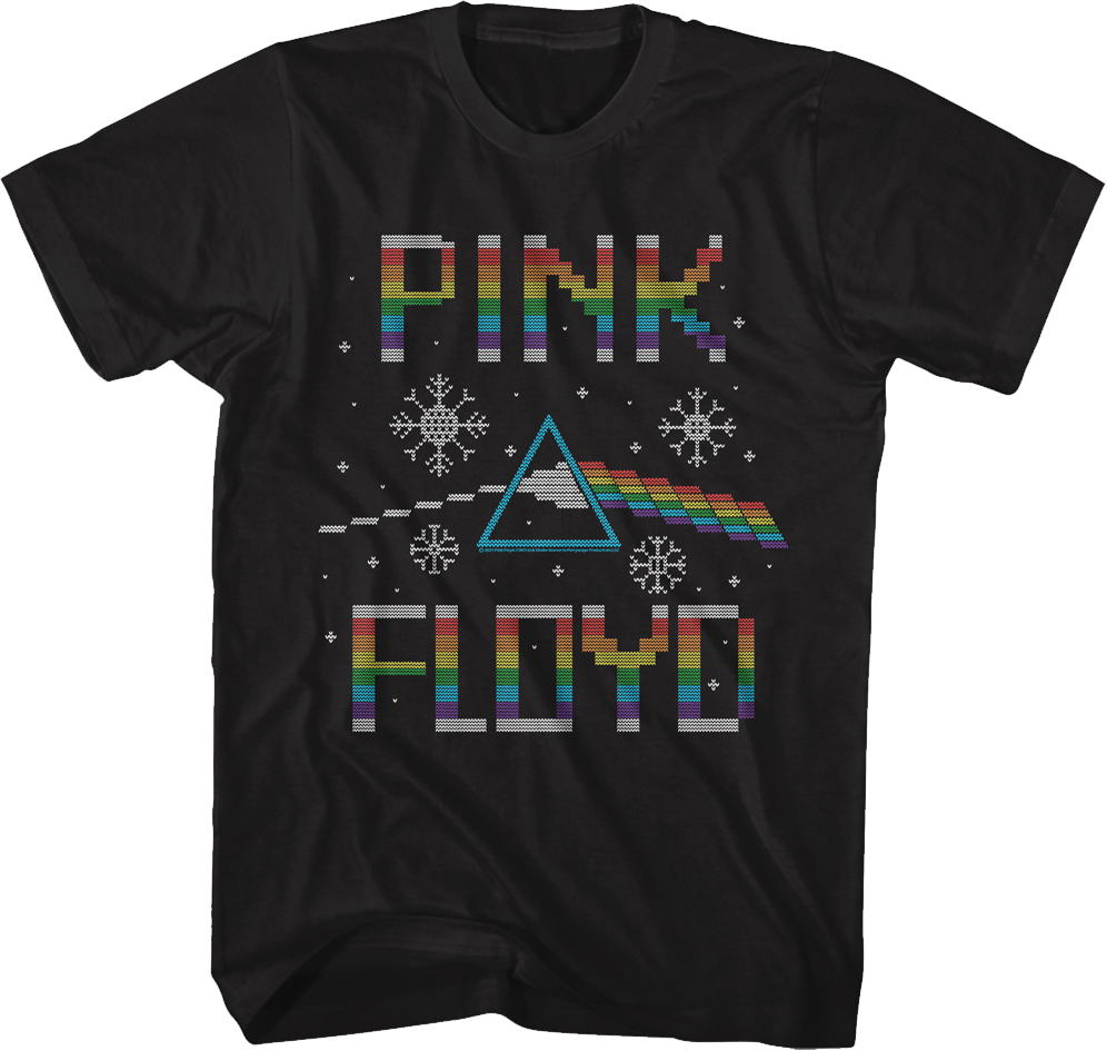 This holiday season, let everyone know that you are a fan of the classic album that includes the songs "The Great Big Gig in the Sky", "Money" and "Brain Damage" with this Dark Side of the Moon Faux Ugly Christmas Sweater Pink Floyd T-Shirt!