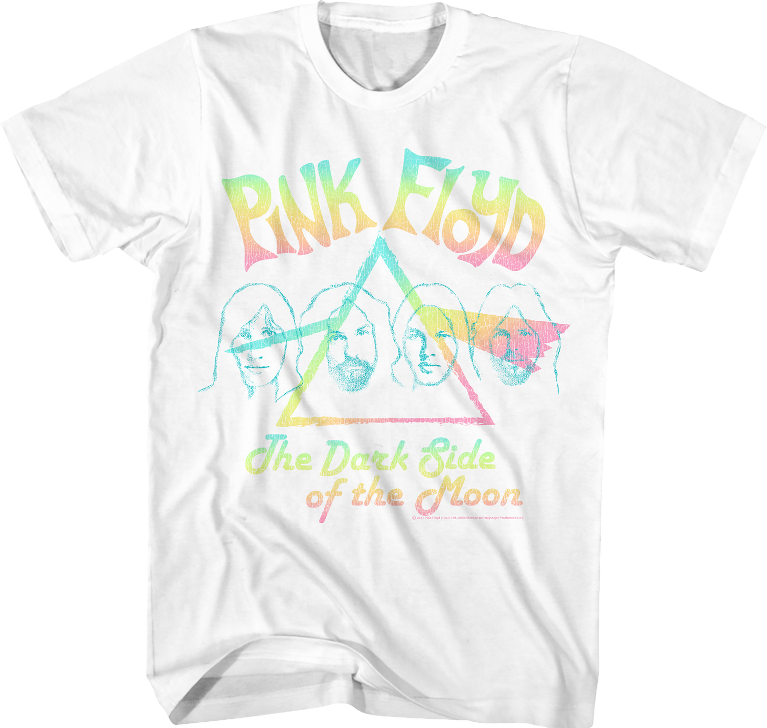 This Pink Floyd t-shirt shows a triangular prism and the faces of band members David Gilmour, Nick Mason, Richard Wright, and Roger Waters in pastel rainbow colors. The shirt includes the title of the hit album The Dark Side of the Moon.