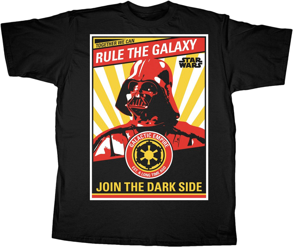 Darth Vader is a powerful Sith lord, a leading force in the Galactic Empire, and one of the most popular villains in cinematic history! Vader appears on this t-shirt, which is designed to look like a propaganda poster for the Galactic Empire, which was established a long time ago in galaxy far, far away.
