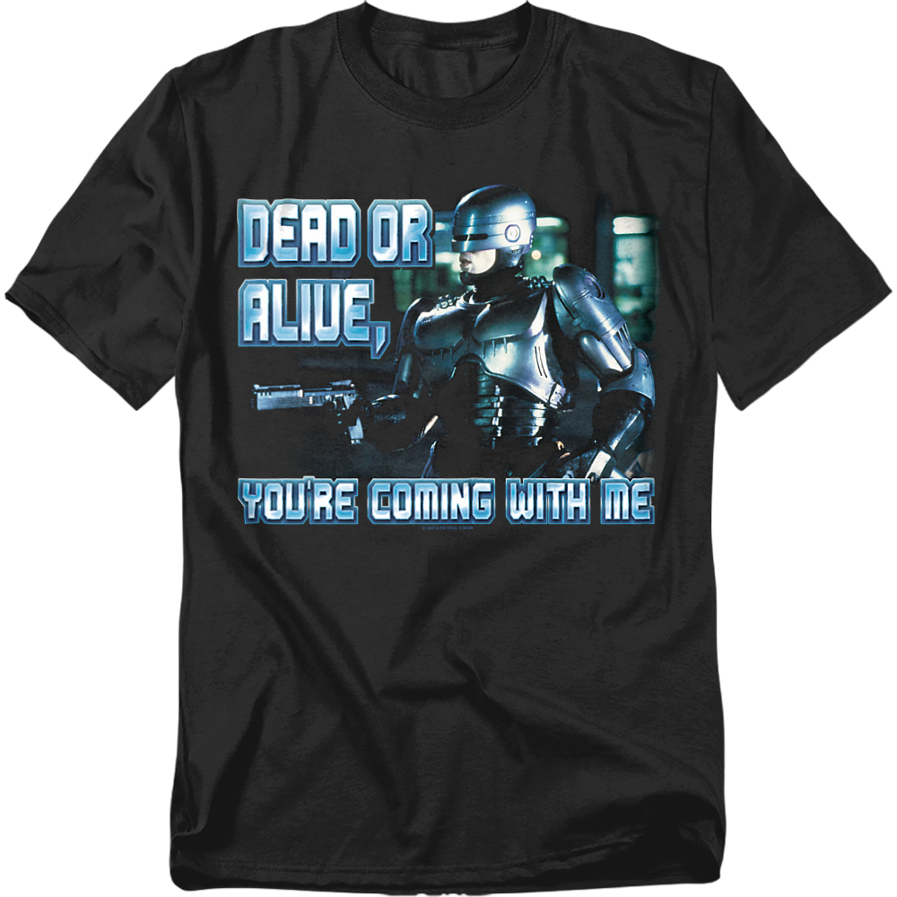 This Robocop t-shirt features an image of the future of law enforcement pointing his Beretta 93R machine pistol. The shirt reads Dead Or Alive, You're Coming With Me.