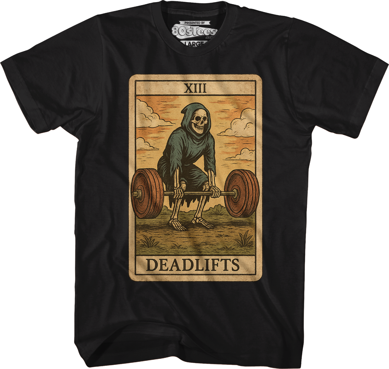 This 80sTees.com exclusive t-shirt shows the Grim Reaper lifting weights on a tarot card. The shirt reads Deadlifts.