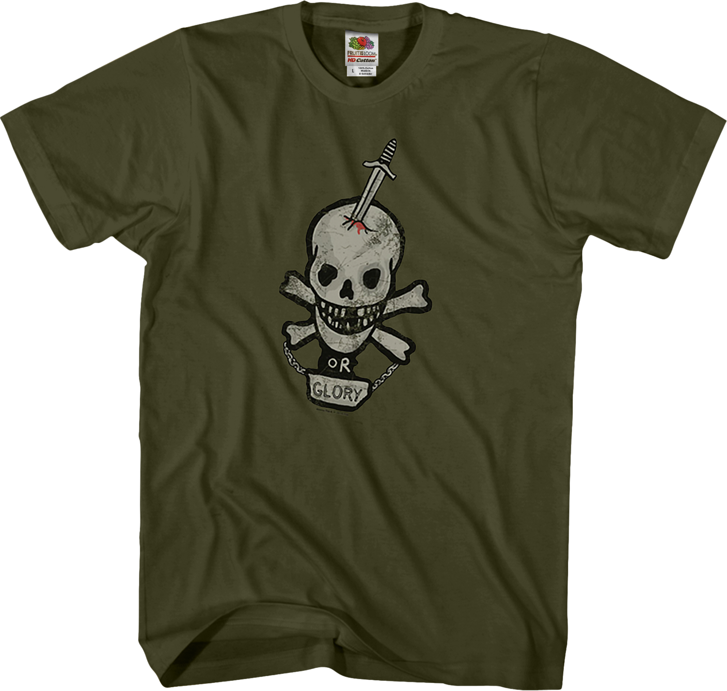 This Alien t-shirt features the customized Death or Glory image that William Hudson wore on his chest plate. The image shows a dagger piercing a skull and crossbones. The phrase Or Glory appears underneath.