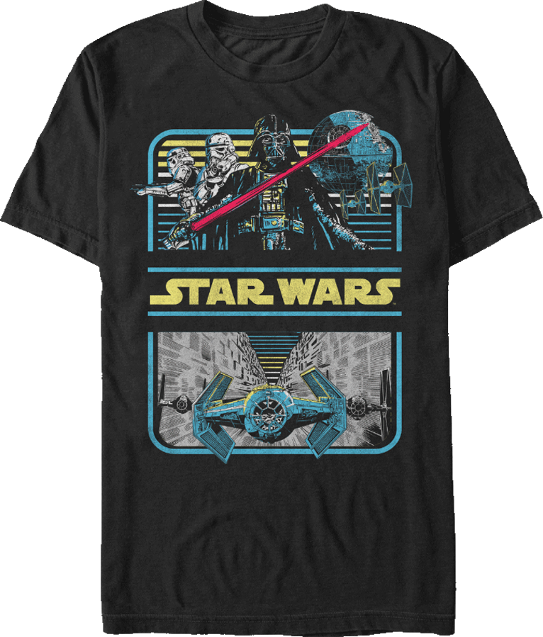 This Star Wars t-shirt shows Darth Vader and Stormtroopers posing in front of the Death Star and TIE Fighters. The middle of the shirt shows the Star Wars logo. The bottom of the shirt shows TIE Fighters flying through the Death Star trench.