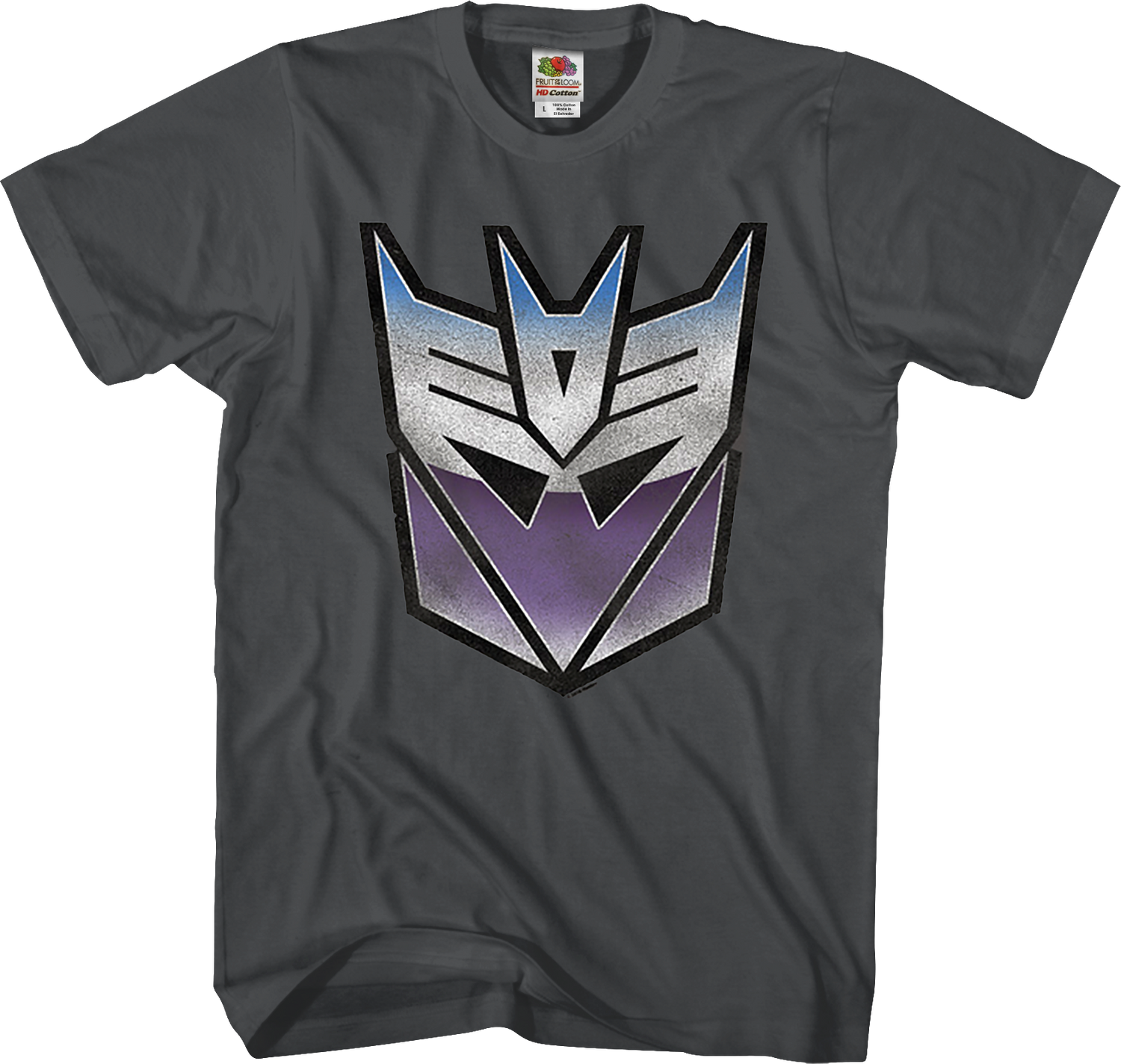 This Transformers t-shirt shows a distressed Decepticons logo. From 1984-1987, Transformers was one of the most popular cartoons on television, and it is still regarded as one of the greatest animated series of all time, making the Decepticons logo instantly recognizable.