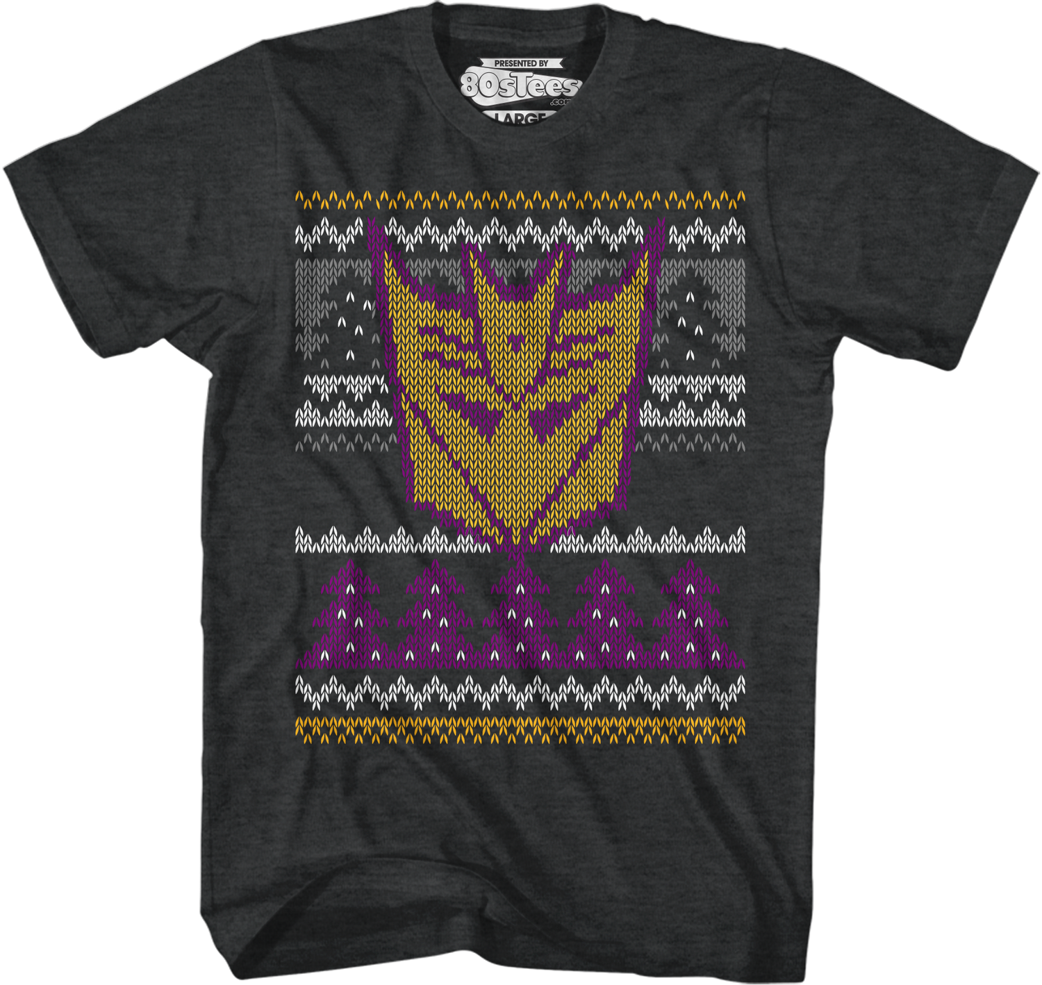 This holiday season, show that you are a fan of the evil robots in disguise with this 80sTees.com exclusive Decepticons Faux Ugly Christmas Sweater Transformers T-Shirt!
