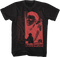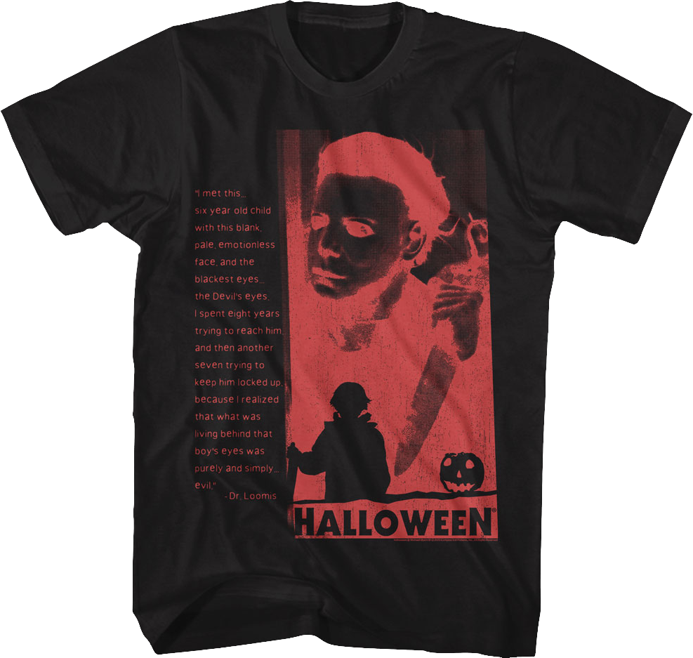 This Halloween t-shirt features a red photo negative of Michael Myers posing with his knife. The shirt also shows a silhouette of young Michael Myers with a knife and a silhouette of a Jack-o'-Lantern. The shirt includes an iconic quote from Dr. Loomis.