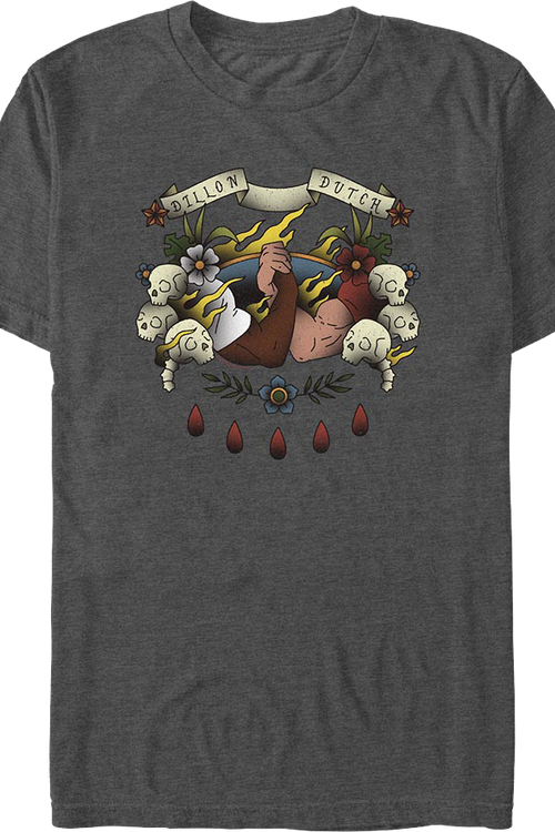 This Predator t-shirt shows Dillon and Dutch's muscular handshake surrounded by a banner, stars, flowers, flames, skulls, and blood drops.