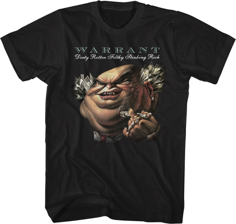 This Warrant t-shirt features the cover artwork for the band's debut studio album Dirty Rotten Filthy Stinking Rich. The artwork shows a character named Fugazi, who is an overpaid, amoral infrastructure manager and archetypal business psychopath.