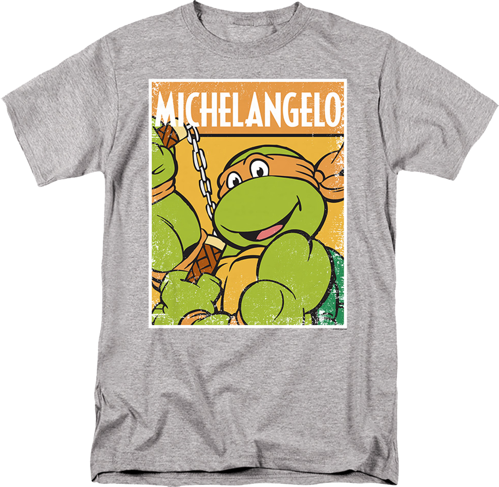 Michelangelo is physically the smallest of the team, but he has a big personality. He is definitely the party animal of the ninja turtles. Mikey's favorite weapon is his dual nunchaku. Michelangelo is instantly recognizable with his orange mask. Everyone will know you are a fan when you wear this Distressed Michelangelo Photo Teenage Mutant Ninja Turtles T-Shirt!