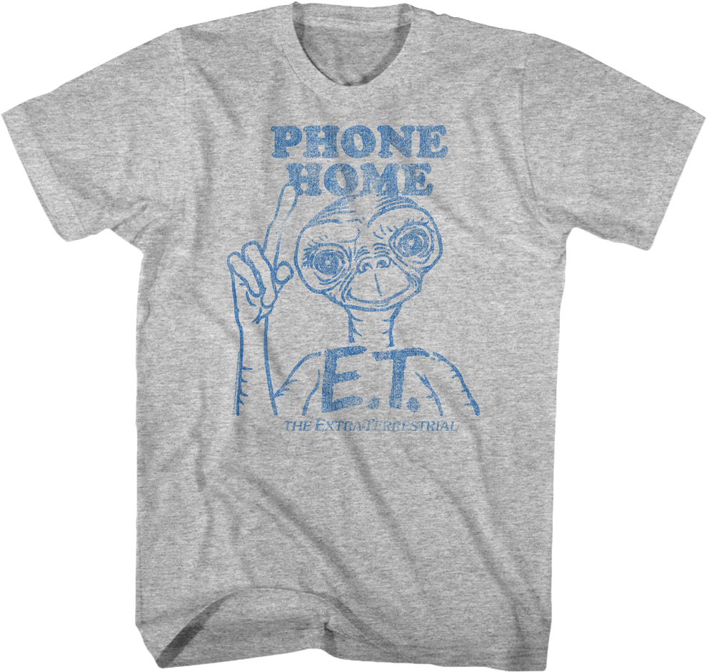 This distressed ET shirt features an image of the Extra-Terrestrial pointing up. The shirt reads Phone Home.