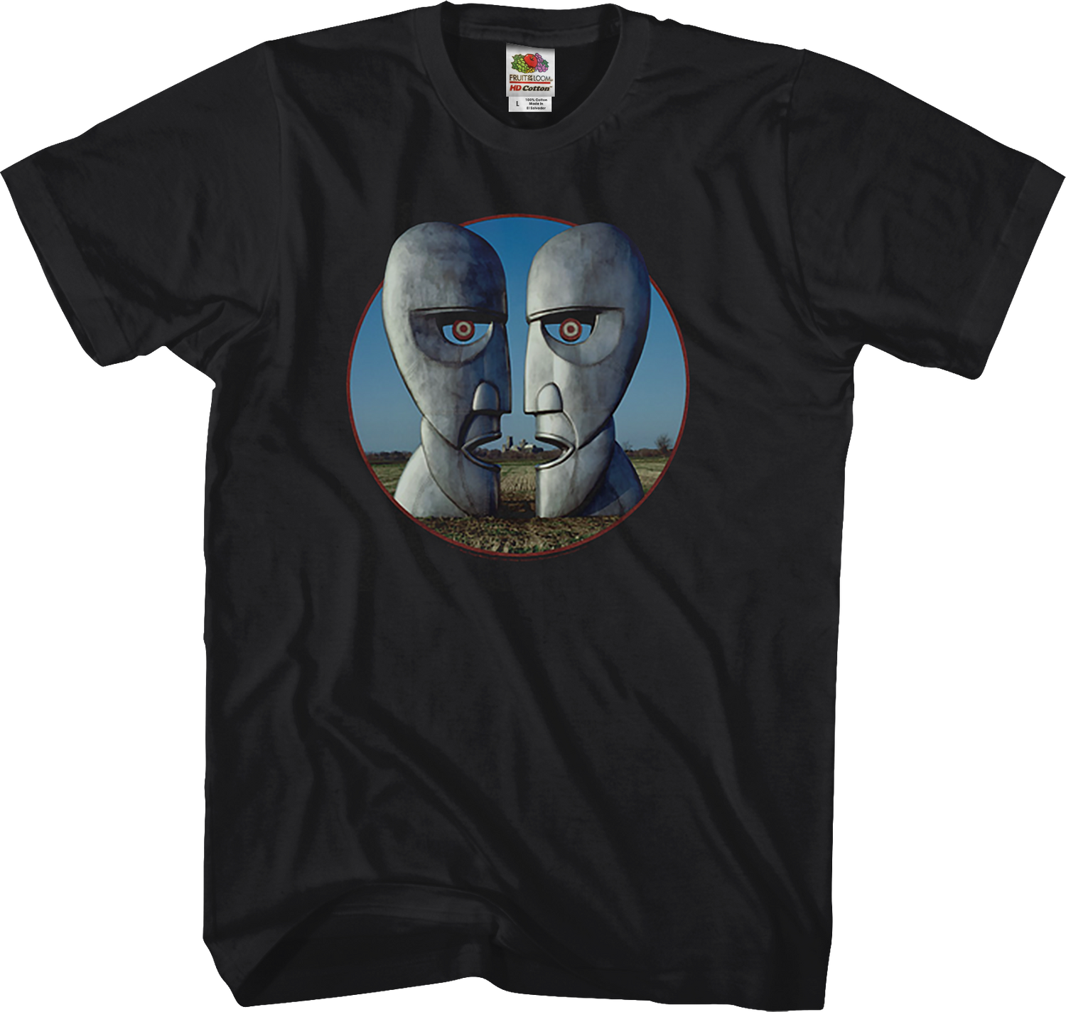 This Pink Floyd t-shirt features the cover artwork for the band's fourteenth studio album, The Division Bell. The artwork shows two large metal heads facing each other in a field near the Ely cathedral in Cambridgeshire, England.