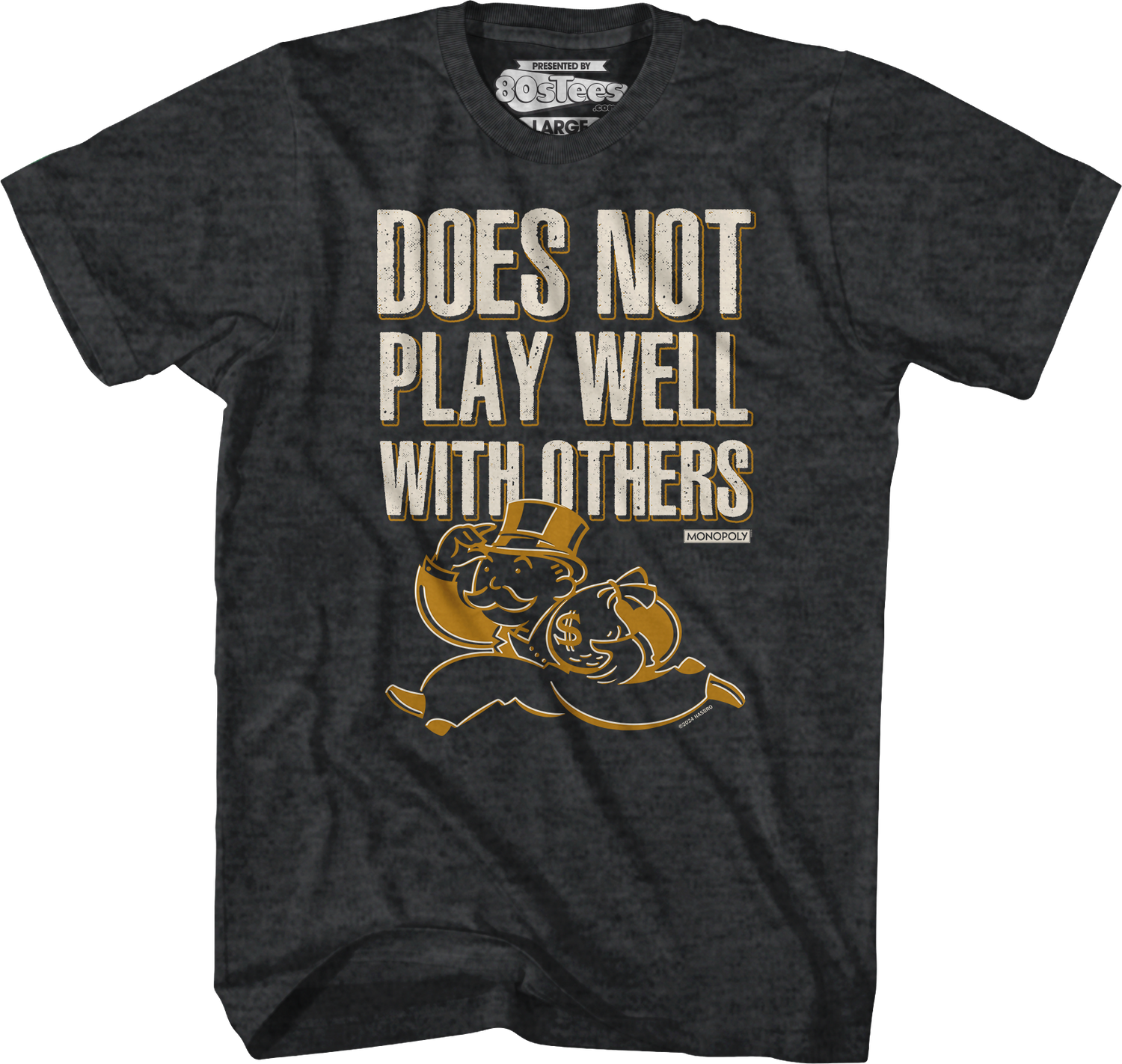 Everyone will immediately know you are a fan of the classic board game when you wear this 80sTees.com exclusive Does Not Play Well With Others Monopoly T-Shirt!