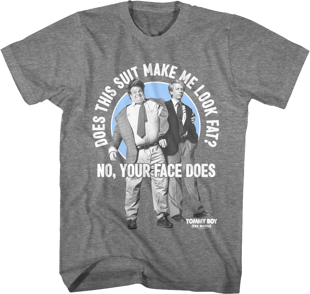 This Tommy Boy t-shirt shows Tommy Callahan and Richard Hayden. The shirt reads Does This Suit Make Me Look Fat? No, Your Face Does.