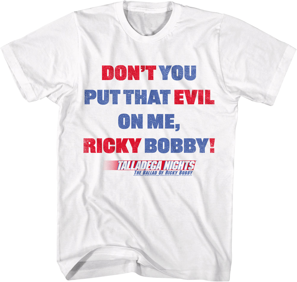 Everyone will instantly know you are a fan of the 2006 comedy classic starring Will Ferrell, John C. Reilly, and Michael Clarke Duncan when you wear this Don't You Put That Evil On Me Ricky Bobby Talladega Nights T-Shirt!