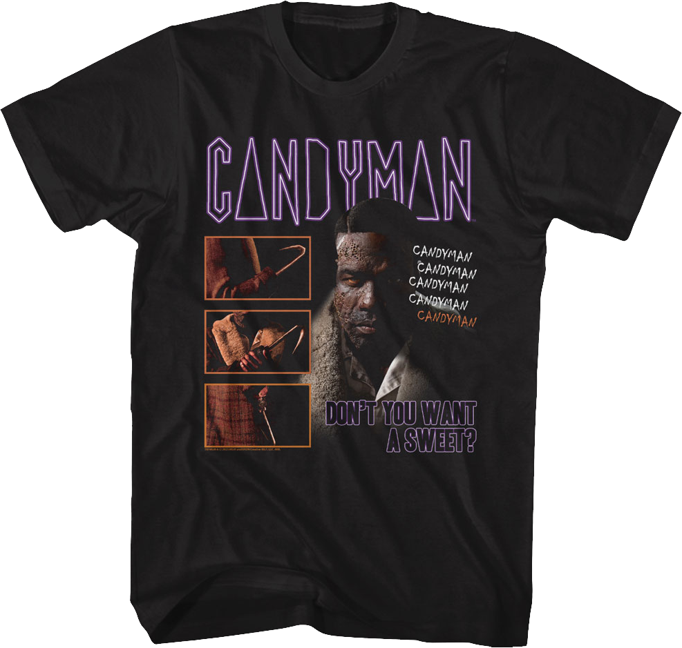 Everyone will instantly know that you are a fan of the terrifying cult classic when you wear this Don't You Want A Sweet? Candyman T-Shirt.