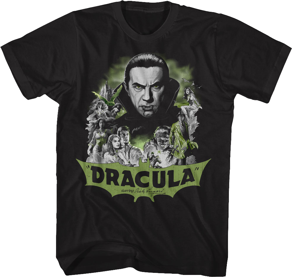 This Bela Lugosi t-shirt features a Dracula collage poster for the 1931 Universal classic.
