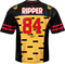 The front of this jersey includes the Dreadnoks logo, the striped design of Ripper's tank top, and the filecard that appeared on the back of the box for the Ripper action figure. The sleeves show red stripes, and the shoulders show the iconic Cobra logo. The back of the jersey shows a striped design, the name Ripper, and the jersey number 84 because the Dreadnoks made their GI Joe debut in 1984.
