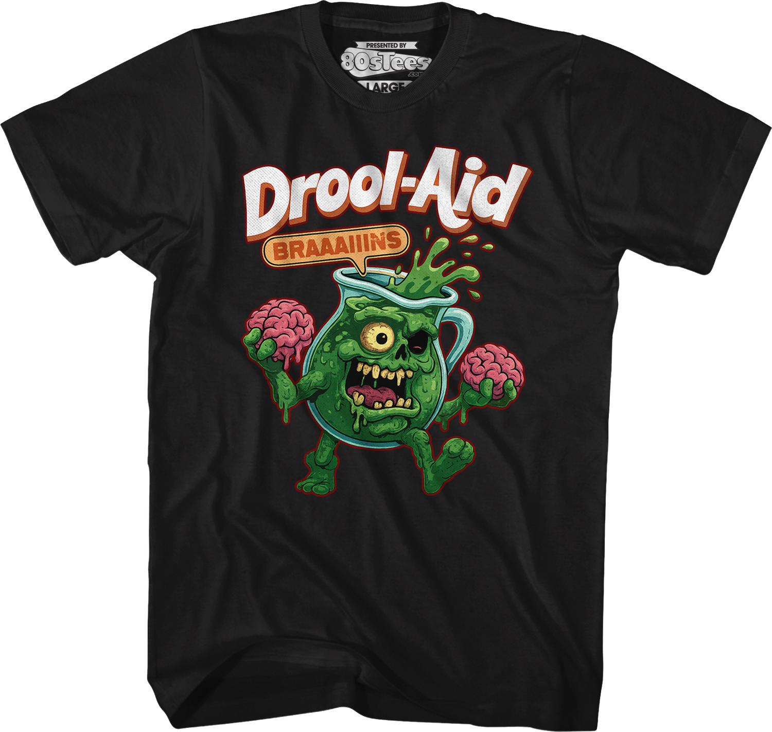 This 80sTees.com exclusive t-shirt features a drooling zombie version of the Kool-Aid Man who is hungry for brains. The shirt reads Drool-Aid.
