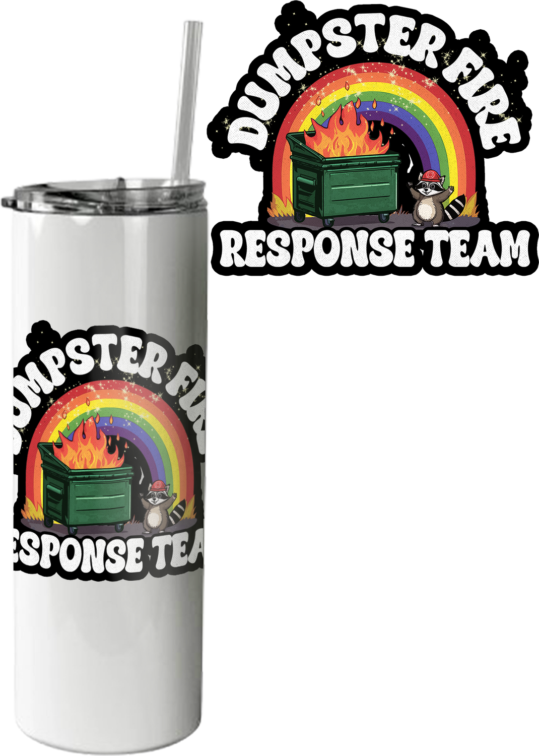 This 20 ounce tumbler shows a sparkling rainbow above a dumpster that is on fire. The tumbler features a racoon that is a member of the highly trained Dumpster Fire Response Team.