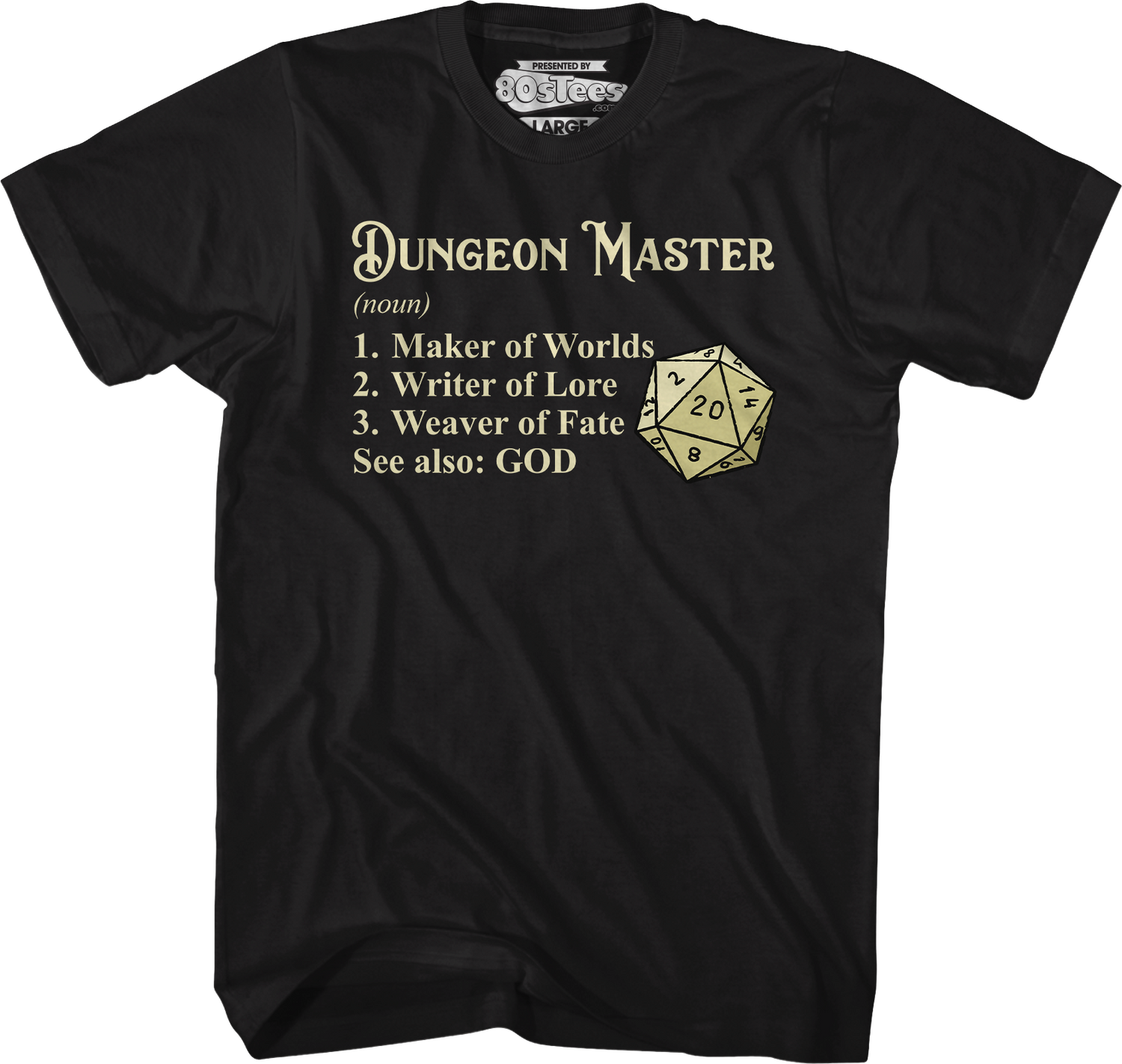 This 80sTees.com exclusive t-shirt features the dictionary definitions for a Dungeon Master, which include 1. Maker of Worlds, 2. Writer of Lore, 3. Weaver of Fate, and "See also: GOD."