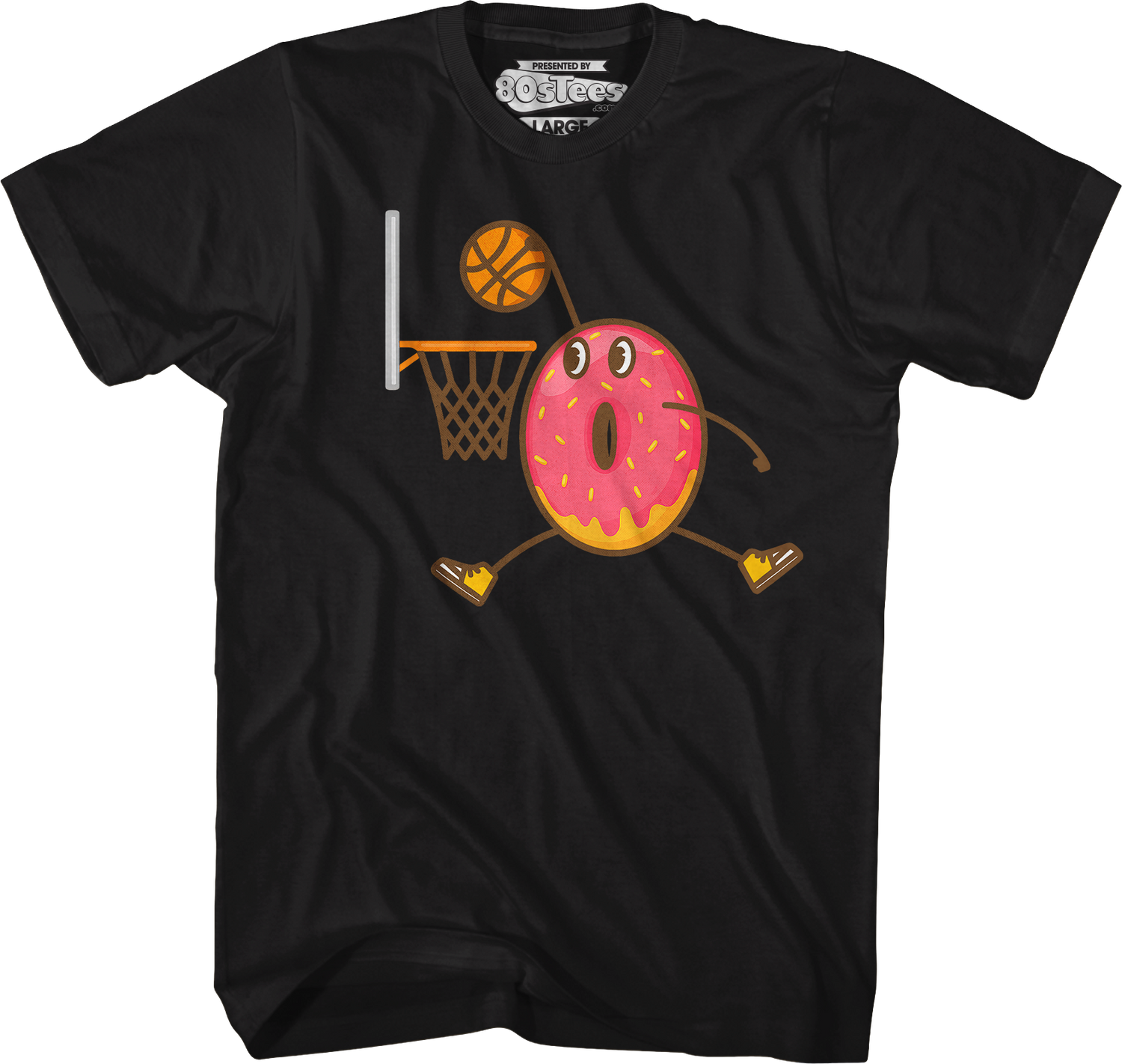 This 80sTees.com exclusive t-shirt shows a donut slam dunking a basketball, making it a dunkin' donut.
