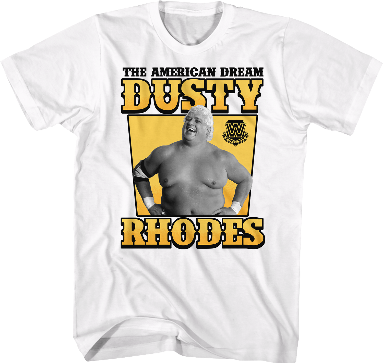Dusty Rhodes was a professional wrestler that the common man could root for. Billed as the son of a plumber, Dusty Rhodes worked hard for the man and became a wrestling legend. This t-shirt features an image of Dusty Rhodes in his wrestling attire, and the shirt reads The American Dream. This Dusty Rhodes t-shirt is the perfect shirt to wear while doing the Common Man Boogie. For any fan of The American Dream, this Dusty Rhodes T-Shirt is a must have.