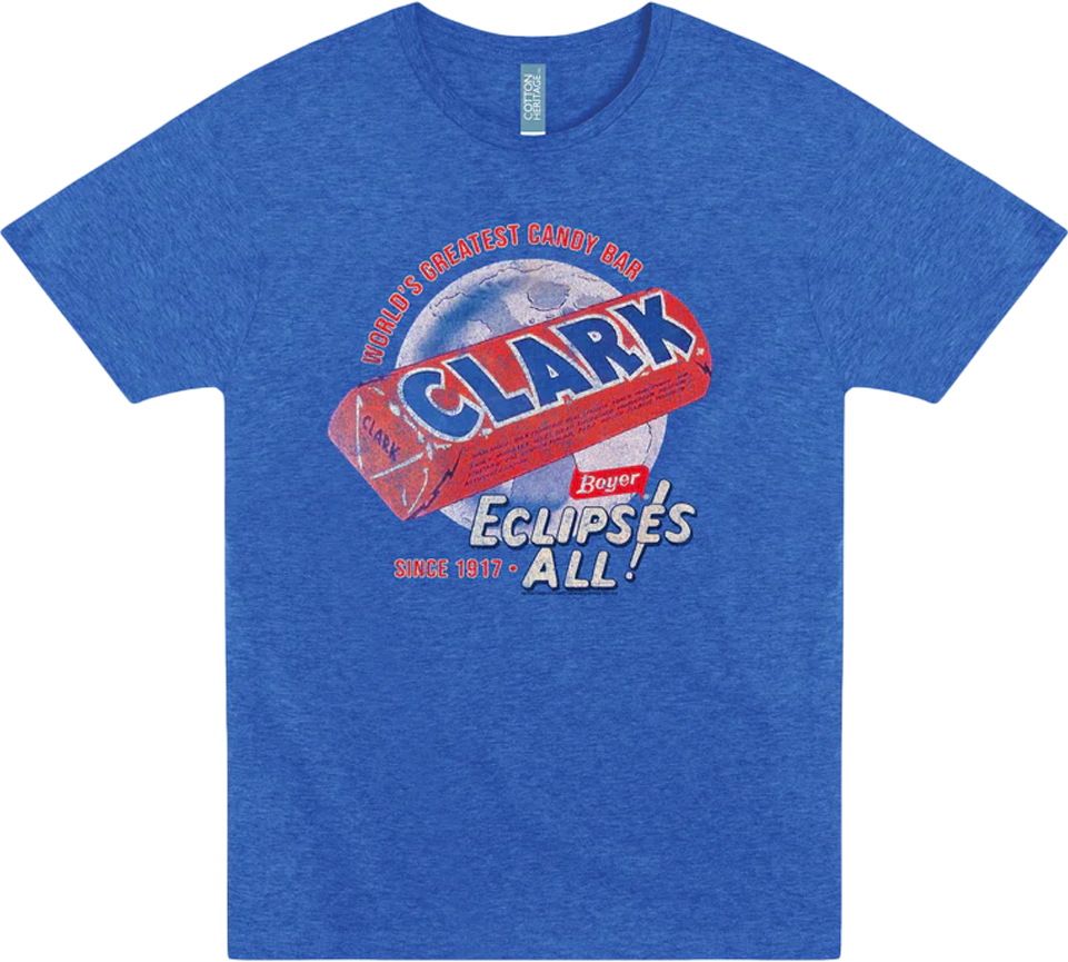 The Clark Bar was one of the earliest combination candy bars, made with a crispy, flaky peanut butter core wrapped in a chocolate coating. The Clark Bar's crunch and roasted peanut taste make it a snack with personality, more rugged than any other candy bar. Everyone will know you are a fan when you wear this Eclipses All Clark Bar Boyer T-Shirt!