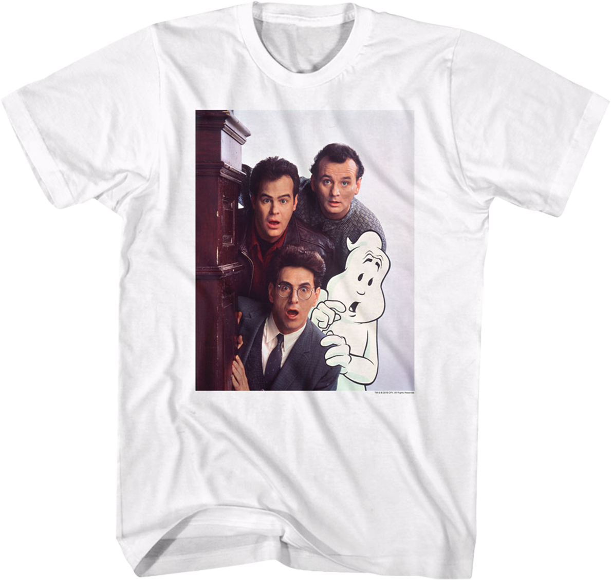 This Ghostbusters t-shirt features shows Egon Spengler, Ray Stantz and Peter Venkman looking in surprise at something strange in their neighborhood. The Ghostbusters are joined by the ghost that usually appears in their logo.